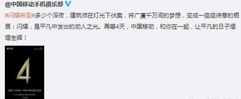中國移動官微的文案中寫道:“#閃耀將至#多少個深夜,建筑師在燈光下伏案,將廣廈千萬間的夢想,變成一座座詩意的棲居;閃耀,是平凡中發出的動人之光。再等4天,中國移動,和你在一起,讓平凡的日子熠熠生輝”!