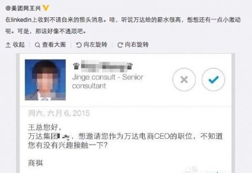 但是,作為挖角CEO的獵頭,其語言水平似乎并不怎么強。王興曝光的私信顯示,獵頭稱:“萬達集團XX,想邀請您作為萬達電商的職位,不知道您有沒有興趣接觸一下?”王興也在微博評論稱“那話好像不通順吧”。