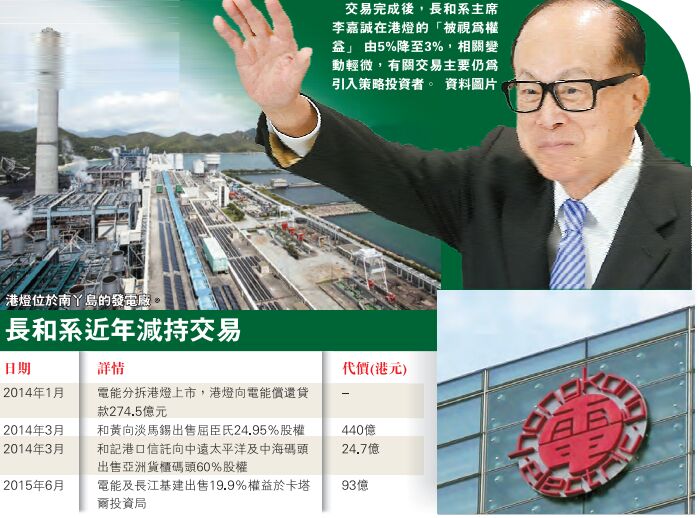 長和發言人表示,交易後主席李嘉誠在港燈的「被視為權益」 由5%降至3%,相關變動輕微,有關交易主要仍為引入策略投資者。瑞銀則發表報告予長和「買入」評級,目標價由178.52元調整至135元。該行估計,長和到2017年的自由現金流,將由去年的110億元,大增至440億元,主要是受到收購英國流動電訊商O2、最近收購的鐵路車輛租賃公司Eversholt及飛機租賃業務所帶來的貢獻,以及屈臣氏的自然增長帶動。