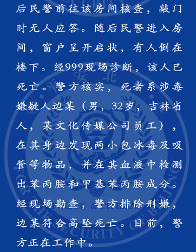 10日19点“平安北京”发微博通报此事详情。“平安北京”称:6月9日2时许,北京警方根据线索,在朝阳北路某小区将吸毒嫌疑人陈某抓获,起获吸毒工具及少量冰毒,现场检测陈某尿检呈冰毒阳性。随后警方发现同住在该小区的边某有重大涉毒嫌疑,后民警前往该房间检查,敲门无人应答。随后民警进入房间,窗户呈开启状,有人倒在楼下,经现场确认,该人死亡。在其身边发现两小包冰毒及吸管等物品。