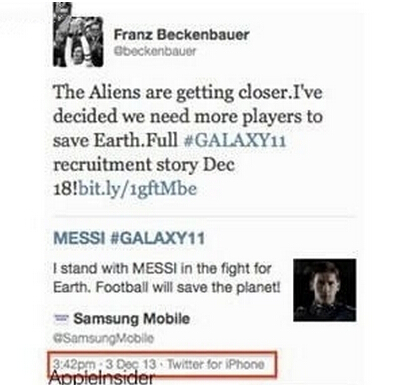 同樣是2013年,三星請來了一票足球大牌給他們做產品形象代言,組成了一支包含 Lionel Messi 在內的 Galaxy 11戰隊。另外還邀請了足球傳奇明星貝肯鮑爾做這支球隊的主教練,然而貝肯鮑爾在推特上發文宣傳相關活動時,用的也是iPhone,當然原文也是很快被刪,當然還是沒逃過“好心”網友神技——追命截圖。