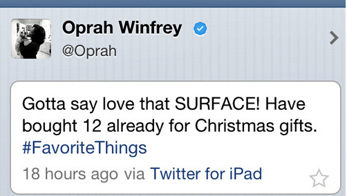 在微軟為Surface瘋狂打廣告的時候,美國的脫口秀女皇奧普拉·溫弗里在Twitter中說道:“我得說我愛死Surface了!已經買了12部來當作圣誕禮物。”但頗為諷刺的是,奧普拉·溫弗里稱贊Surface的推特是用iPad發布的。看到這里,小編明白了原來蘋果才是真正的人生贏家啊!