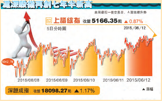 周五早盤,滬指高開沖擊新高后逐步回落,權重股低迷,跳水翻綠逼近5100點;臨近11點煤炭股拉升護盤,滬指探底回升;午后開盤,地產、鋼鐵、有色、央企改革概念拉升,滬指拉升漲逾1%,再創本輪牛市新高5178.19點,臨近尾盤沖高回落漲幅收窄,仍在5200點關口徘徊。兩市逾200股漲停。截至收盤,滬指報5166.35點,漲44.76點,漲幅0.87%,成交10601.67億元;深成指報18098.27點,漲208.59點,漲幅1.17%,成交9048.45億元;創業板報3899.70點,漲37.57點,漲幅0.97%,成交1821.73億元。