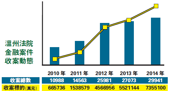 金融機構集中的鹿城區一位金融庭陪審員告訴記者,2015年銀行借貸糾紛案件數量比去年還多,去年一周旁聽40場庭審,今年春節后一周有時要旁聽50場。法官個個超負荷工作,雖然年輕,健康狀況已經開始出現問題了。正是這些法官夜以繼日的工作和翔實公開的審判文字記錄,記者得以觀察到企業和銀行糾紛的沖突細節,糾正之前一味袒護企業主的立場,客觀評估溫州的信用環境。