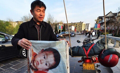 從此,郭剛堂踏上了漫漫尋子苦旅。他將兒子兩歲生日的照片放大,印在油布上制成一面旗子,用大大的楷體字寫著:“兒子,你在哪里?爸爸找你回家”。這面“尋子旗”插在摩托車的后座上,伴隨著他風餐露宿。