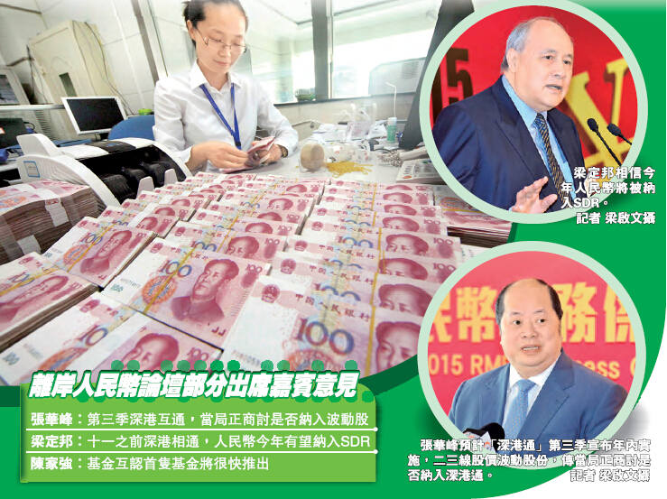 【香港商報網訊】記者程澤杭報道:2015下半年,深港通、基金互認即將推出,同時人民幣國際化也將步入新階段,近日香港金融界管理層人士就隨之而來的發展機遇及挑戰,發表了相關看法及預測。