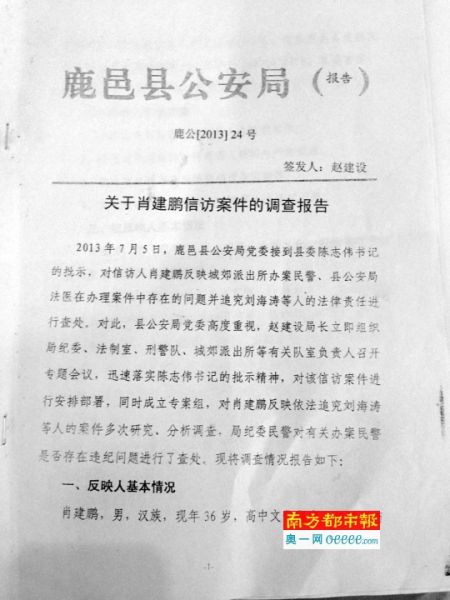 肖建鵬夫婦隨后怒告鹿邑縣公安局有警不出嚴重瀆職,鹿邑縣監察局干部張祥林再次介入調查。