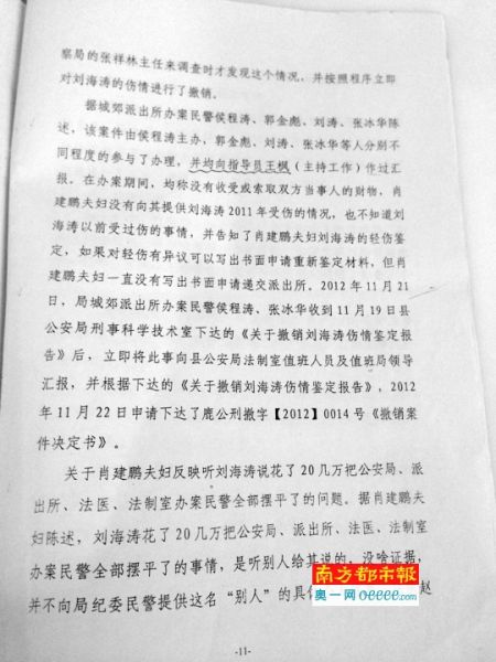 鹿邑紀委監察局糾錯之后,2012年11月19日,鹿邑警方撤銷對劉海濤的傷情鑒定報告,同時撤案并撤回對肖建鵬的刑拘手續。
