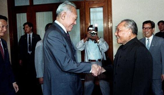 當鄧小平身著米色中山裝,從波音707專機上走下來時,李光耀面帶敬重,走上前與他熱情握手。在李光耀的陪同下,鄧小平檢閱了儀仗隊,之后驅車前往總統府迎賓別墅。
