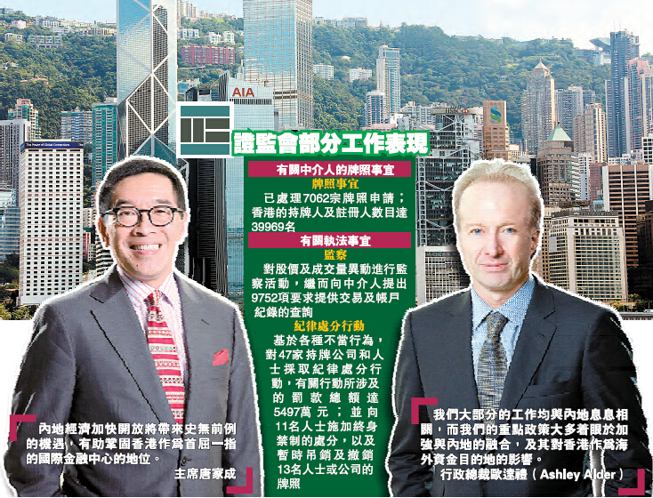 證監會行政總裁歐達禮(MrAshleyAlder)稱:「香港與內地資本市場加快融合,意味著證監會現時大部分工作均與內地息息相關。一如既往,繼續確保投資者保障與嚴厲的執法行動均符合高標準固然至關重要,但我們亦必須對監察金融穩定性及各種操守風險保持警覺。」