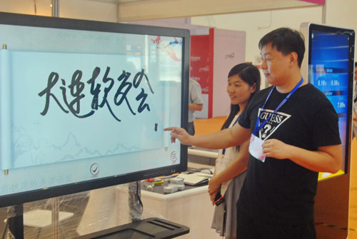 6月16日,参会人员在大连软交会展厅展示一款智能多媒体一体机上的触摸书写功能。