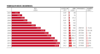 2012年底,中國移動正式工為18.2萬人,而勞務工高達33.5萬人,勞務工比例高達64.7%。經過一系列調整,2014年底,中國移動正式工為24.2萬人,勞務工為23.8萬人。勞務工比例接近49.5%,仍然遠遠超標。