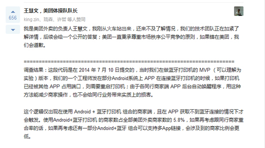 另外代碼的編寫者(已離開美團)也給出了自己的說明,并道歉。代碼編寫者同樣表示,商家App需要通過藍牙打印,但Android手機藍牙模塊只能允許一個App與藍牙設備連接,為了解決爭用導致無法打印的問題,就直接寫了關閉其他應用的代碼。