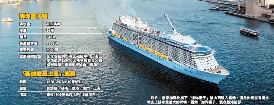 是次訪港的「海洋量子」號,樓高16層、排水量達16.8萬噸、最高載客量更達4905人(詳見附表),為全球排水量第四大郵輪,亦是歷來到訪本港郵輪之最。