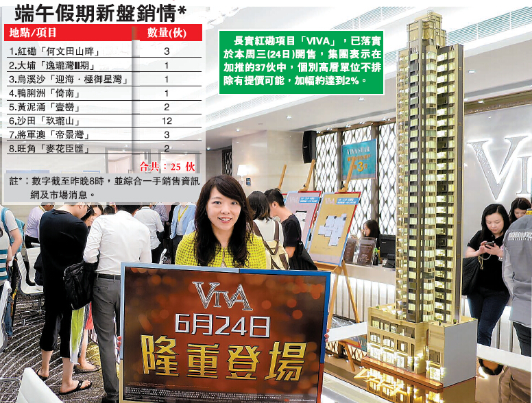 其他一手盤方面亦錄得零星成交,其中九建(034)旗下旺角「麥花臣匯」周六促成兩宗成交,涉及單位分別為實用面積412平方尺的1B座E室及636平方尺的1A座E室,前者成交價為955萬元,折實尺價約23192元,后者則以1503萬沽出,折實尺價約23635元。另外,永光旗下黃泥涌「壹鑾」、恒地(012)烏溪沙「迎海極御星灣」及鴨昪洲「倚南」及信置(083)大埔「逸瓏灣II期」均錄得成交。至於目前正蓄勢待發的長實(1113)紅磡「VIVA」,已落實於本周三(24日)開售,集團表示在加推的37伙中,個別高層單位不排除有提價可能,加幅約達到2%。