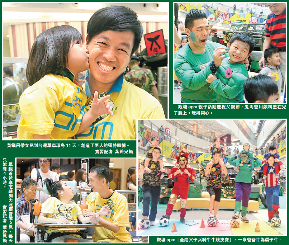 【香港商報网訊】實習記者葉鈴兒報道:觀塘apm商場於昨日父親節正日舉行親子活動,邀請一眾「非常爸爸」分享育兒經歷。有單親爸爸為照顧患有嚴重智障女兒,每日只睡4小時,曾想過放棄終因一個女兒一個擁抱打消念頭;亦有爸爸為了補償以往因為工作繁忙所錯過的時光,帶同女兒到臺灣以單車環島11天,創造與女兒的獨特回憶。