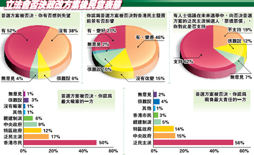 调查结果显示:普选方案被否决,五成二受访者对此「有」感到失望,而表示「没有」的则占三成八,反映大部分市民对普选行政长官愿望落空感失望。