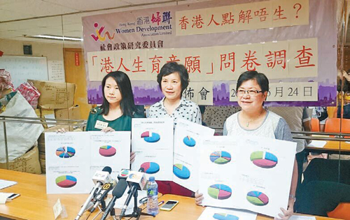 「妇联」于4月份以问卷形式访问了485名人士,以了解港人生育意愿,发现有约六成人愿意生育小孩,与去年调查的比例相若;在男士群组中,只有四成六人愿意生育,主要是因不少男士都是全职工作人士,在外奔波劳碌,自然缺乏养儿育女的意欲。而家庭月入低于12000元的群组中,亦只有五成三人愿意生育,此群组一般是家庭主妇、半职人士,因收入较低等经济因素而拒绝生育;但在29岁或以下的群组中,却有多达六成四人愿意生育,结果令人惊喜。