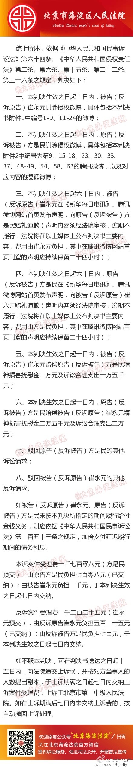 据北京市海淀区人民法院官方微博消息,海淀法院今日上午9时30分公开宣判原告(反诉被告)方是民(笔名方舟子)与被告(反诉原告)崔永元名誉权纠纷案。