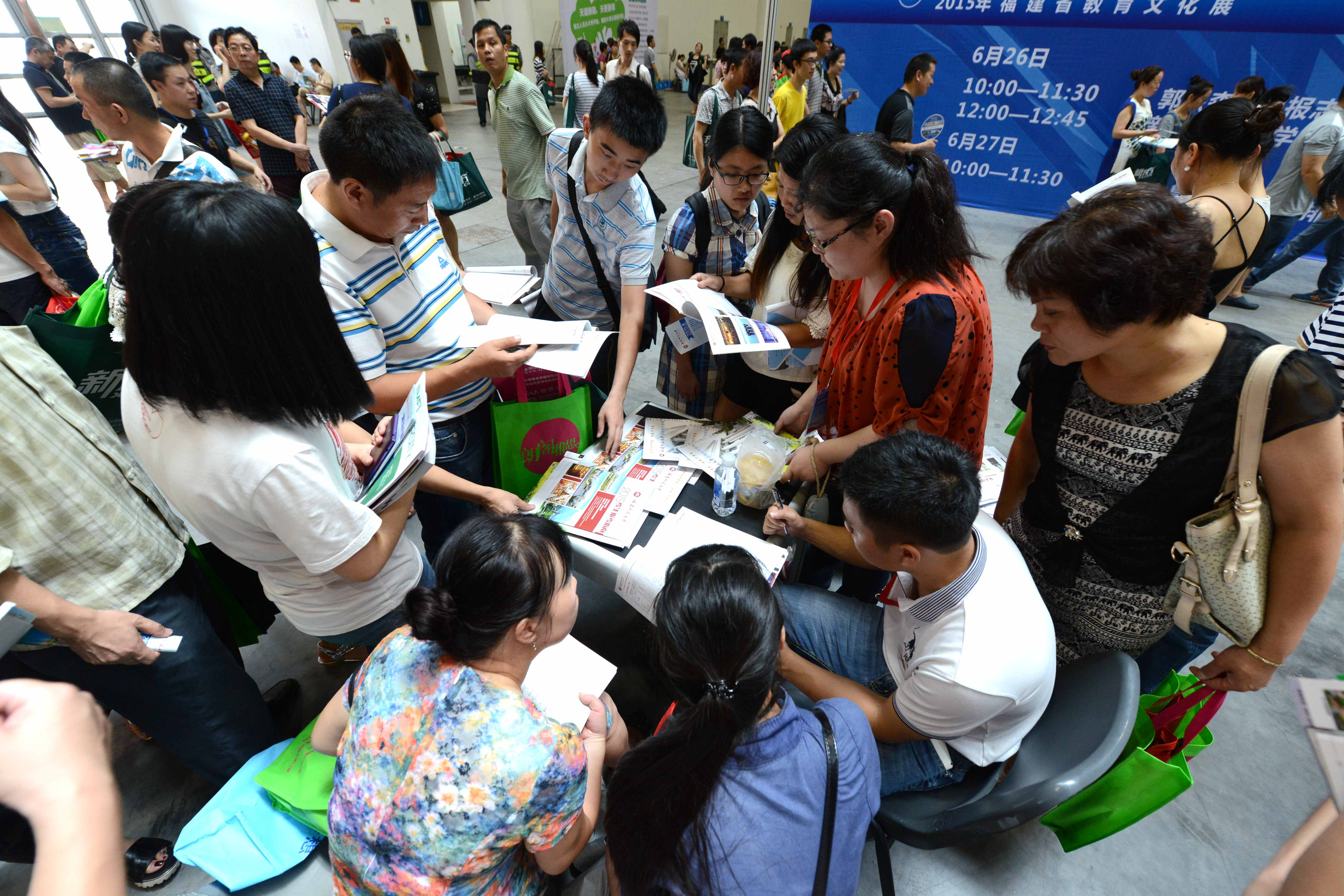 福建 “高招”咨询会 家长考生齐上阵。 6月26日,由福建省教育考试院主办的“2015年福建省普通高校招生咨询会”在福州海峡国际会展中心举行。全国300多所院校参展,包括众多985、211著名院校,不收取任何费用。图为咨询会现场家长考生齐上阵。