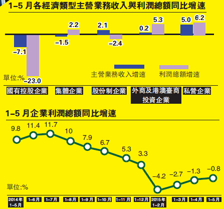 1-5月份,在規模以上工業企業中,國有控股企業實現利潤總額4603.3億元,同比下降23%;外商及港澳臺商投資企業實現利潤總額5819.4億元,增長5.3%;私營企業實現利潤總額7857.8億元,增長6.2%。
