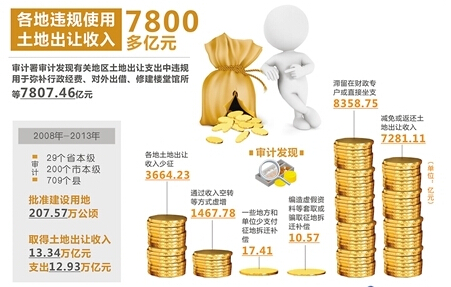 此次審計發現的問題集中在土地出讓收支、建設用地、土地利用和耕地保護三方面。其中,土地出讓收支方面的問題主要包括:土地出讓收入少征3664.23億元,通過收入空轉等方式虛增1467.78億元;支出中違規用于彌補行政經費、對外出借、修建樓堂館所等7807.46億元;征地拆遷中,一些地方和單位少支付補償17.41億元,編造虛假資料等套取或騙取補償10.57億元。此外,一些地方土地出讓收支核算不夠規范,有8358.75億元滯留在財政專戶或直接坐支;有的地方為支持經濟,減免或返還土地出讓收入7218.11億元。