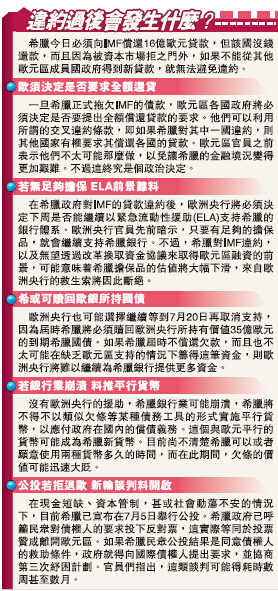 而希臘若無法在今日償還IMF的16億歐元貸款,該國銀行業的流動性援助會即時被凍結。所以,德國總理默克爾和歐洲央行的高層們必須作出一重要決定,這就是在保證歐元區不受危機傳染的同時,給予希臘喘息機會,從而使其公投能夠盡量得到樂觀結果。