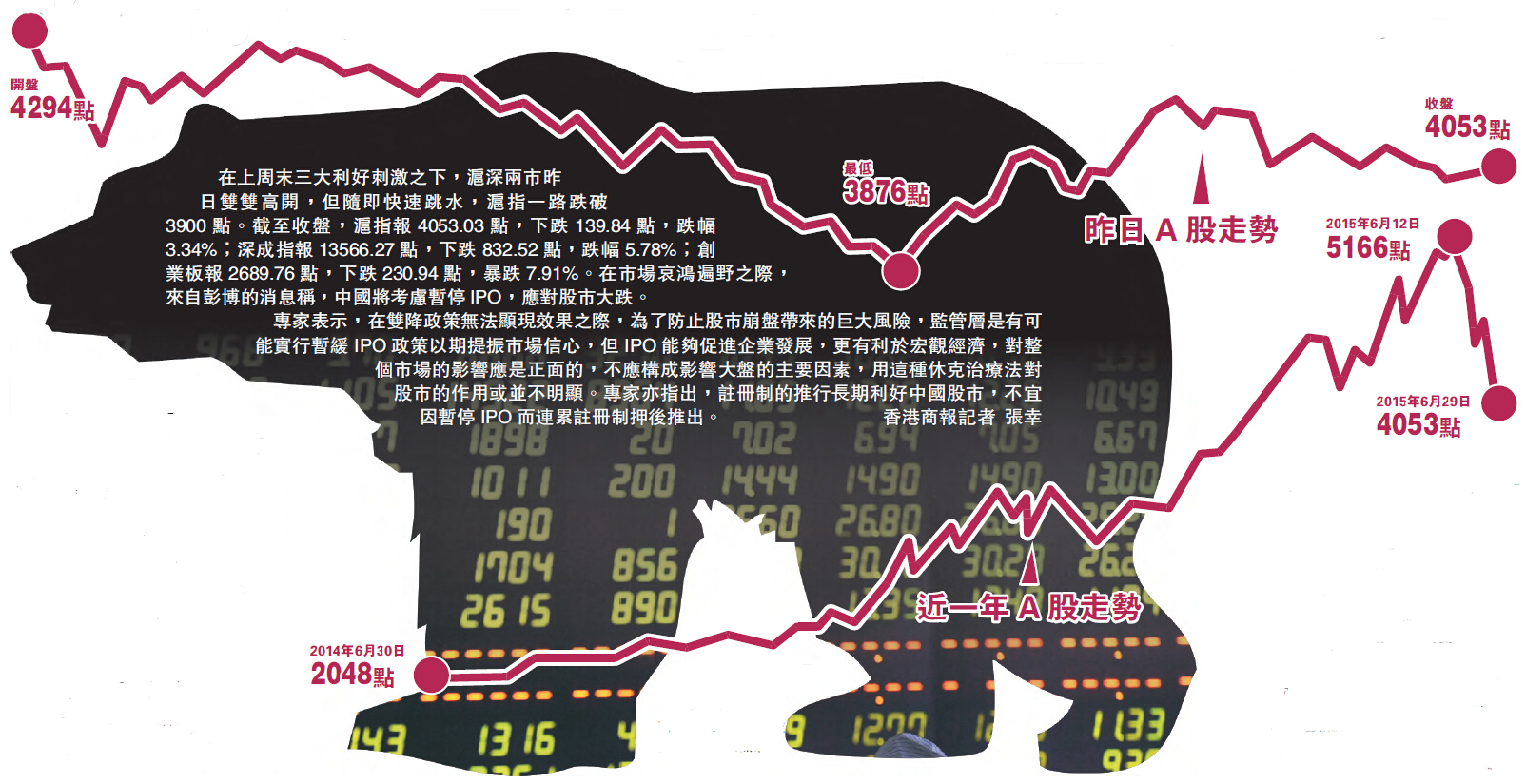 有分析人士指出,现在中国股市已到了很危险的时刻,即非常明确地来到牛熊分界线一带,如果大盘不能站稳4000点,这种千股跌停的模式,许多资金根本就没有出逃的机会。所以管理层必须出组合拳,出手更加有针对性的举措挽回这濒临崩盘的股市,紧急暂停IPO就是选项之一,这也是中国股市历来陷入低迷时的惯用手段。