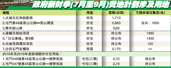為解決本港住宅供應不足問題,本屆政府一直積極加大賣地建屋計劃。其中,昨日政府就率先公布來季賣地計劃,預計將推出3幅位於新界地區的住宅官地,當中包括大埔白石角、屯門第48號青山公路及青衣細山路地皮,料可提供1650個單位。此外,西鐵元朗站項目以及早前未能趕在首季推出的「日出康城」第8期項目,亦將納入來季賣地計劃之中,預計前者可提供1880個單位,後者亦涉及1430個單位,連同市建局西灣河項目的120個單位,估計來季私人住宅供應數目將達到5100個。不過值得注意的是,在來季賣地計劃中,涉及港鐵上蓋項目的住宅供應量將佔總供應伙數中的67%,若撇除有關項目數量後,實質涉及其他用地的來季私人住宅供應量僅為上季一半。