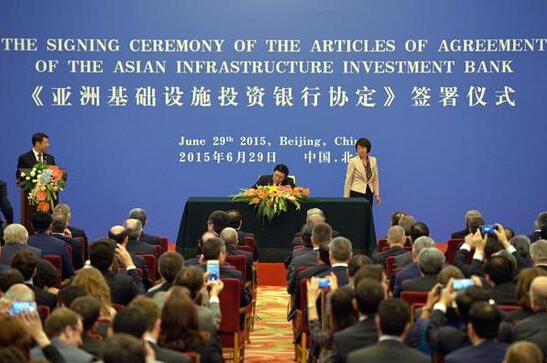 【中國經營網綜合報道】6月29日,中國財政部部長樓繼偉(主席臺中)作為中方授權代表簽署《亞洲基礎設施投資銀行協定》。當日,亞洲基礎設施投資銀行(亞投行)的57個意向創始成員國代表在北京出席《亞洲基礎設施投資銀行協定》簽署儀式,標志著成立亞投行及其日后運營有了各方共同遵守的“基本大法”,邁出籌建最關鍵的一步。