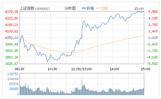 截止收盤,滬指報4277.22點,漲224.19點,漲幅5.53%;深成指報14337.97點,漲771.69點,漲幅5.69%;創業板報2858.61點,漲168.85點,漲幅6.28%;大數據I300指數報3851.80點,漲214.32點,漲幅5.89%。