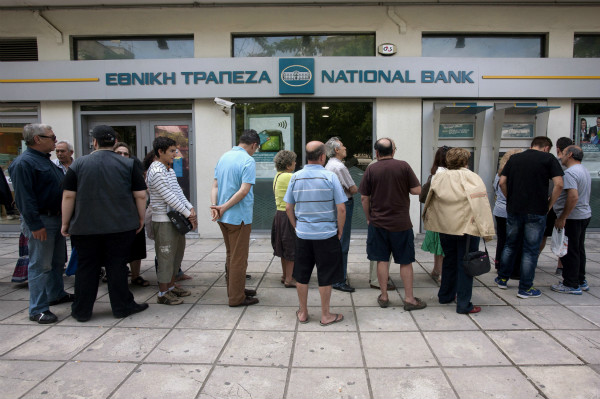 6月27日,人们在希腊首都雅典一家银行的取款机前排队取款。