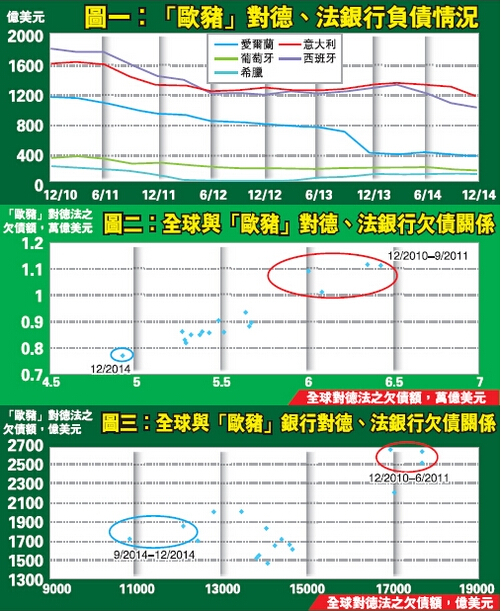 其實意、西等國近年對德法銀行的欠債持續下降是常態。圖二見到,2010年至今,全球對德法銀行業的欠債額與「豬國」同樣呈正比關係。圖中右上方見到,無論是全球還是「豬國」欠兩地債務,2010年底至2011年都是近5年來最高水平。然而,隨著歐債危機穩定下來,加上美國經濟復蘇步伐良好以及各地對債務問題關注度提高,積極減債已成大勢。截至2014年底,圖中見到,全球或「歐豬」欠德法的債務均已跌至多年低位。故此,大家實在難怪一眾債權人對希臘如此多要求,因為希臘處理自身財政確實未如理想。換句話說,希臘一直沒有正視自身財政紀律問題。