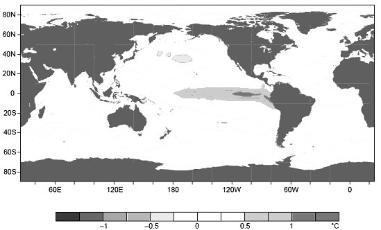 正常年份,由于赤道上空東風帶的存在,赤道西太平洋表層海水較東太平洋溫度顯著偏高,東南亞地區常年維持著活躍的對流上升運動和較高的降水量。厄爾尼諾出現時,赤道上空的東風顯著減弱甚至發生反向,導致赤道東太平洋表層海水向西太平洋的運動減弱,從而造成西(東)太平洋海表溫度減低(升高),對流活動減弱(增強)。因此,厄爾尼諾年份,東南亞地區(南美洲秘魯沿岸)降水顯著減少(增加)。