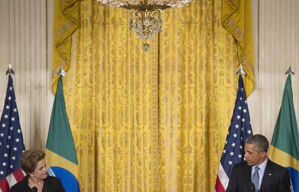 6月30日,在美國華盛頓,美國總統奧巴馬(左)與巴西總統羅塞夫在出席聯合記者會后離開。新華社/法新