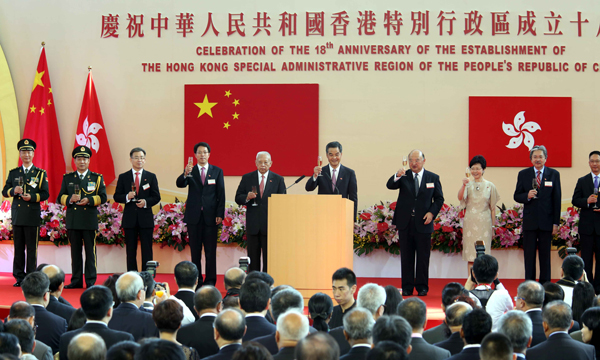昨早,特區政府舉行升旗儀式及酒會,慶祝香港回歸祖國18周年。全國政協副主席董建華,行政長官梁振英,中聯辦主任張曉明,解放軍駐港部隊司令員譚本宏、政委岳世鑫,立法會主席曾鈺成,以及特區政府官員、行政會議成員、立法會議員、本地社團領袖和社會各界人士等都有出席,共賀特區生辰。