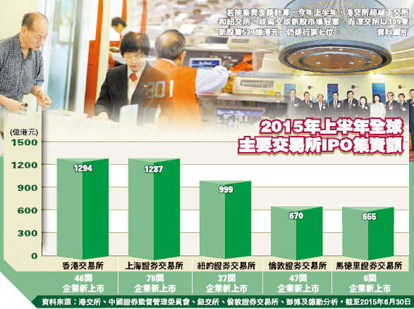 【香港商報網訊】記者伍敏報道:隨著內地資本帳開放及各項金融改革逐步落實,近年來中港股市熾熱成焦點,新股集資活動更加位冠全球。德勤昨發表報告更新,上半年有46間公司於本港上市,集資額達1294億元,以7億元的輕微優勢,壓過上海交易所,成為上半年全球新股集資額最大的市場,亦是2011年以來最佳的半年表現。紐約交易所就以999億元排行第三位。而對於內地新股上市註冊制修訂及本港同股不同權機制遭證監否決,業界普遍認為不會影響下半年新股來港上市。