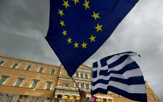 圖中為歐盟標識旗及希臘國旗。 REUTERS/YANNIS BEHRAKIS