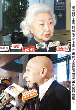 去年11月成立的「團結香港基金」昨早舉行第5次顧問會議,今次會議歷時約兩小時,主要商討政改後的香港局勢,以及中港矛盾、樓價高企、年輕人向上流動和國家認同等問題。出席者包括董建華、榮譽顧問楊鐵樑、前財政司司長梁錦松、基本法委會員副主任梁愛詩、醫管局主席梁智仁等逾50人。