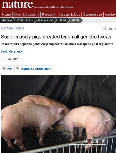 日前,Nature/news报道了延边大学尹熙俊教授团队的研究成果,报道题目为“Super-muscly pigs created by small genetic tweak”(通过基因小范围改良生产超级瘦肉型猪, Nature 523,13-14 02 July 2015 doi:10.1038/523013a)。此项创新性成果是由我校尹熙俊教授课题组与首尔国立大学Jin-Soo Kim团队合作完成。《Nature》杂志是国际上最具影响力的学术期刊之一。其发表的论文代表了某一重要科学问题的实质性进展,具有近期和远期的重要影响,此次为我校首次在Nature News上报道的科研成果。