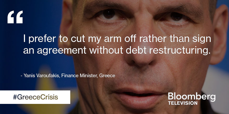 隨著銀行關閉以及經濟受困于資本管制,瓦魯法斯基在彭博電視采訪中表示,他寧愿“切斷我的胳膊”也不愿意簽署一份無法重組希臘債務的協議。國際貨幣基金組織(IMF)表示,未來三年希臘將需要以更寬松的條件從歐元區籌集至少360億歐元(400億美元)的貸款,才可能維持債務的可持續性。
