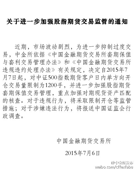 7月6日晚,中金所決定自明日起,對中證500指數期貨客戶日內單方向開倉交易量限制為1200手,並進一步加強股指期貨套期保值交易管理,重點加強對期現貨資產匹配的核查。