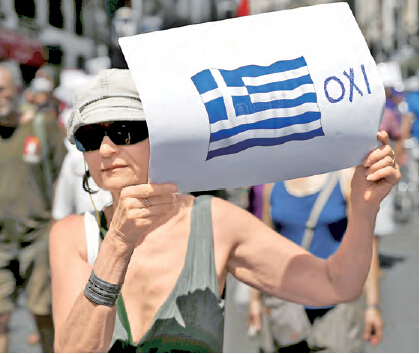 一位婦女高舉紙牌,上面印有希臘國旗及表示向債權人說不的文字。