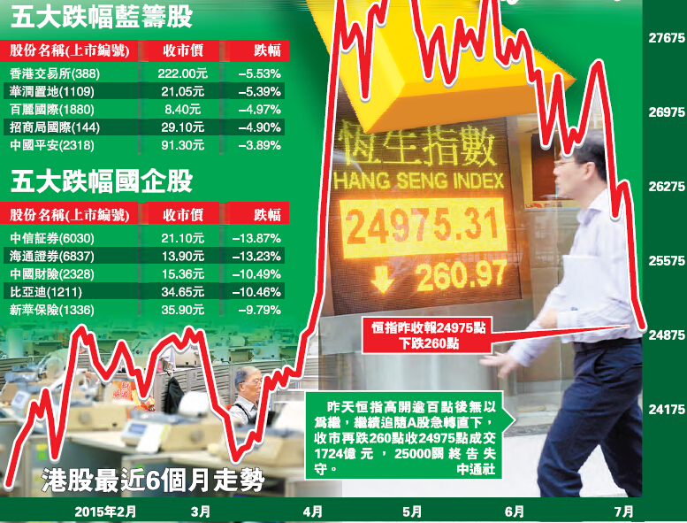 【香港商報網訊】記者伍敏報道:雖然希債危機下全球投資氣氛轉差,惟港股成全球重災區,跌幅遠超歐美國家,昨天恒指高開逾百點后無以為繼,繼續追隨A股急轉直下,收市再跌260點收24975點成交1724億元,25000關終告失守,騰訊(700)及港交所(388)未止跌,截至截稿時,夜期更跌逾700點。內地救市將中證500指數期貨客戶日內單方向開倉交易量限制為1200手,惟結果仍告失效,中證及深證齊齊恢復跌勢。