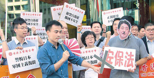 工联会社会事务委员会约30人于日本驻港领事馆外,高叫「安保恶法,人人谴责」、「警惕军国主义复辟」、「正视历史,不容抵赖」等口号,并撕毁日本军旗,抗议安倍推行安保法,要求日本政府正视侵华史实、遏止日本国内右翼势力和日本军国主义复辟,以史为鉴,防止历史重演。
