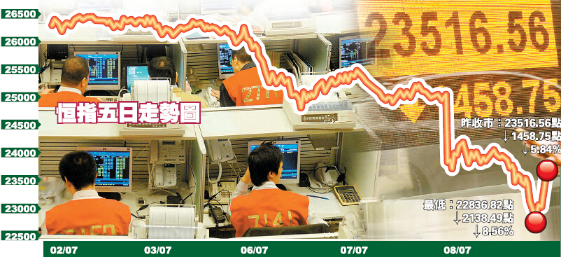 【香港商報網訊】記者伍敏、實習記者李灼彤報道:內地股市及希債危機兩個「颱風眼」持續影響港股,意外股災7年後重來!昨日,恒指一度跌破23000點低見22836點,收市跌幅收窄至5.84%報23516點,為2008年以來第四大單日跌幅。當天,共449隻牛證遭強制收回,成為自2006年牛熊證面世以來最多收回的一天。港府表示本港資金流向「相當平穩」,並呼籲市民冷靜處理投資。