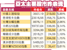 【香港商報網訊】在A股連續暴跌和希臘債務危機雙重夾擊下,受到嚴重拖累的不僅僅是本港股市。昨日,亞太主要股市股指全數下跌。其中,台股大跌274點,為近4年最大,並跌破9000點大關;日經225種股票平均價格指數大跌3.14%,失守20000點關口。