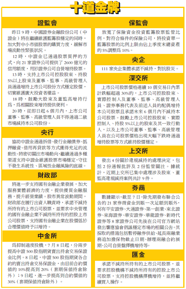 12时,中证金已通过股票质押的方式,向21家证券公司提供了2600亿元的信用额度,用于证券公司自营增持股票。13时,支持上市公司控股股东、持股5%以上股东及董事、监事、高级管理人员通过增持上市公司股份方式稳定股价,切实维护广大投资者权益。