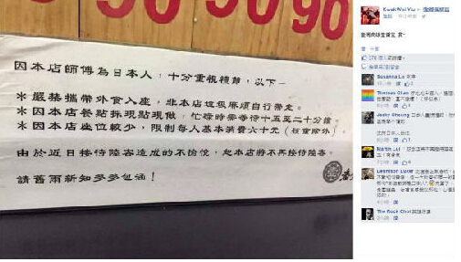 臺灣東森新聞網7月10日報道,有網友將公告拍照放到臉書社團“強國瘋情話”上,告示上寫著,該店師傅是日本人,“十分重視禮節”,除了規定非本店垃圾要自行帶走,以及訂立基本消費等規則之外,最后一行規定更在網路上引起討論。因為該店表示,“由于近日接待大陸游客造成的不愉悅,恕本店將不再接待陸客。”