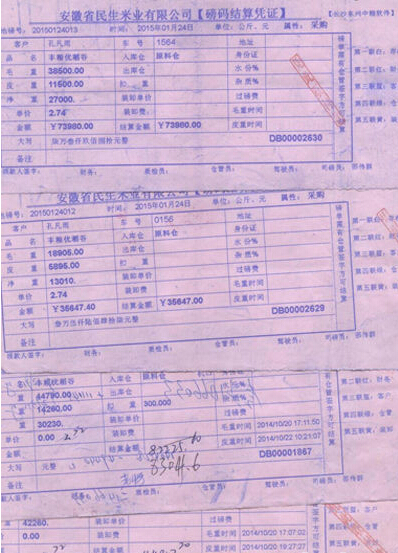 不少村民和糧食經紀人向記者出示了2014年賣糧時拿到的票據,上面寫著:中央儲備糧全椒直屬庫最低收購價糧食入庫檢驗檢斤結算單,售糧人、過磅記錄、等級單價等基本信息記載清楚,票據下方有檢驗員、司磅員、入庫驗收的人名印章,而付款員處為空白。